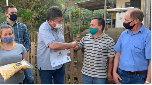 Prefeito Vannei Mafissoni acompanhou entrega de selo para o casal, Marines e Marcos Kruze. Só com trabalho se irá trazer desenvolvimento, disse Vannei