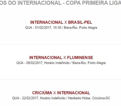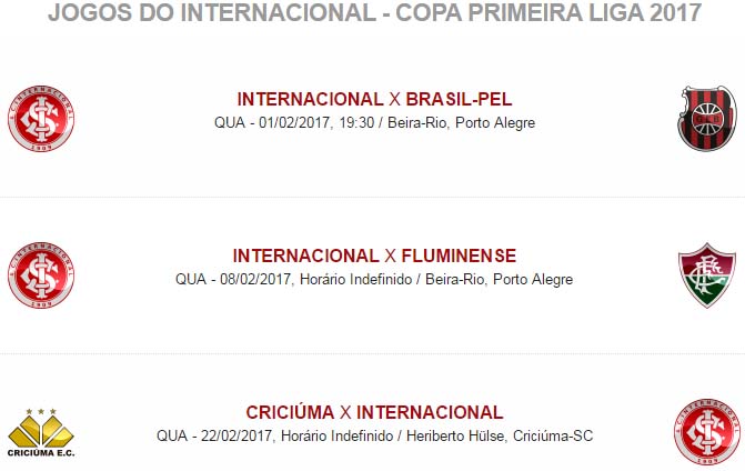 O primeiro jogo oficial da temporada 2017 está definido: será contra o Brasil-PEL, no dia 1º de fevereiro, Beira-Rio, pela partida de estreia na Copa Primeira Liga. O Colorado está no Grupo A do torneio, junto a Criciúma e Fluminense. Ao todo, 16 times disputarão a competição que será realizada pelo segundo ano consecutivo. Confira: