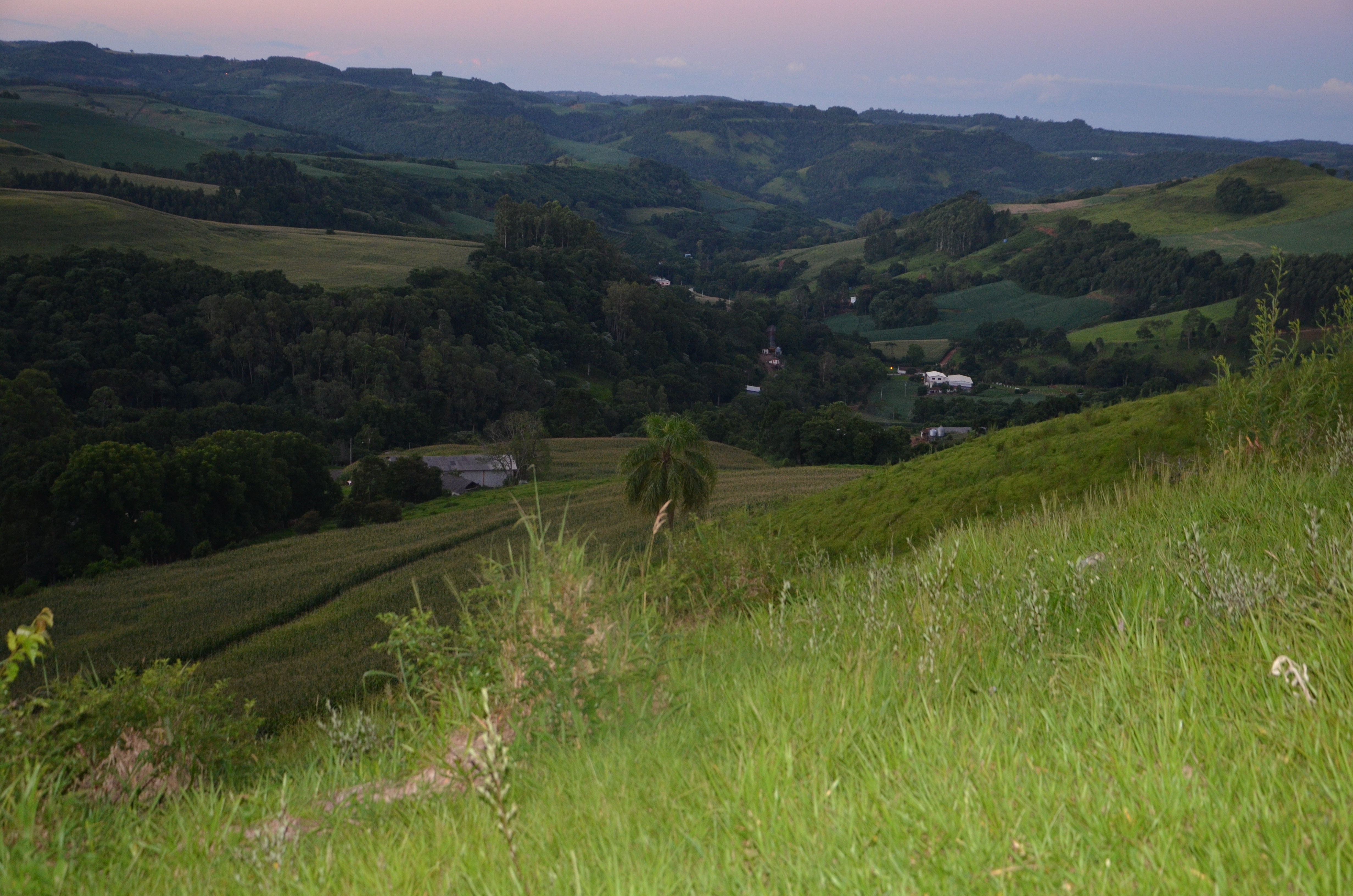 “Não deixar mais do que pegadas, não tirar mais do que fotos, não levar mais do que saudades”. A placa na entrada do Morro do Vicini - destino seguinte do passeio - é um aviso educado dos cuidados com a natureza. A bela vista que se encontra no local é anunciada ainda no caminho, já que trajeto é marcado pelas as paisagens desenhadas pela mistura das plantações de soja e trigo com as altas árvores e montanhas verdes, formadas por mata virgem. Este conjunto é, talvez, a característica que mais chama atenção no percurso realizado entre as estreitas e sinuosas estradas de chão.