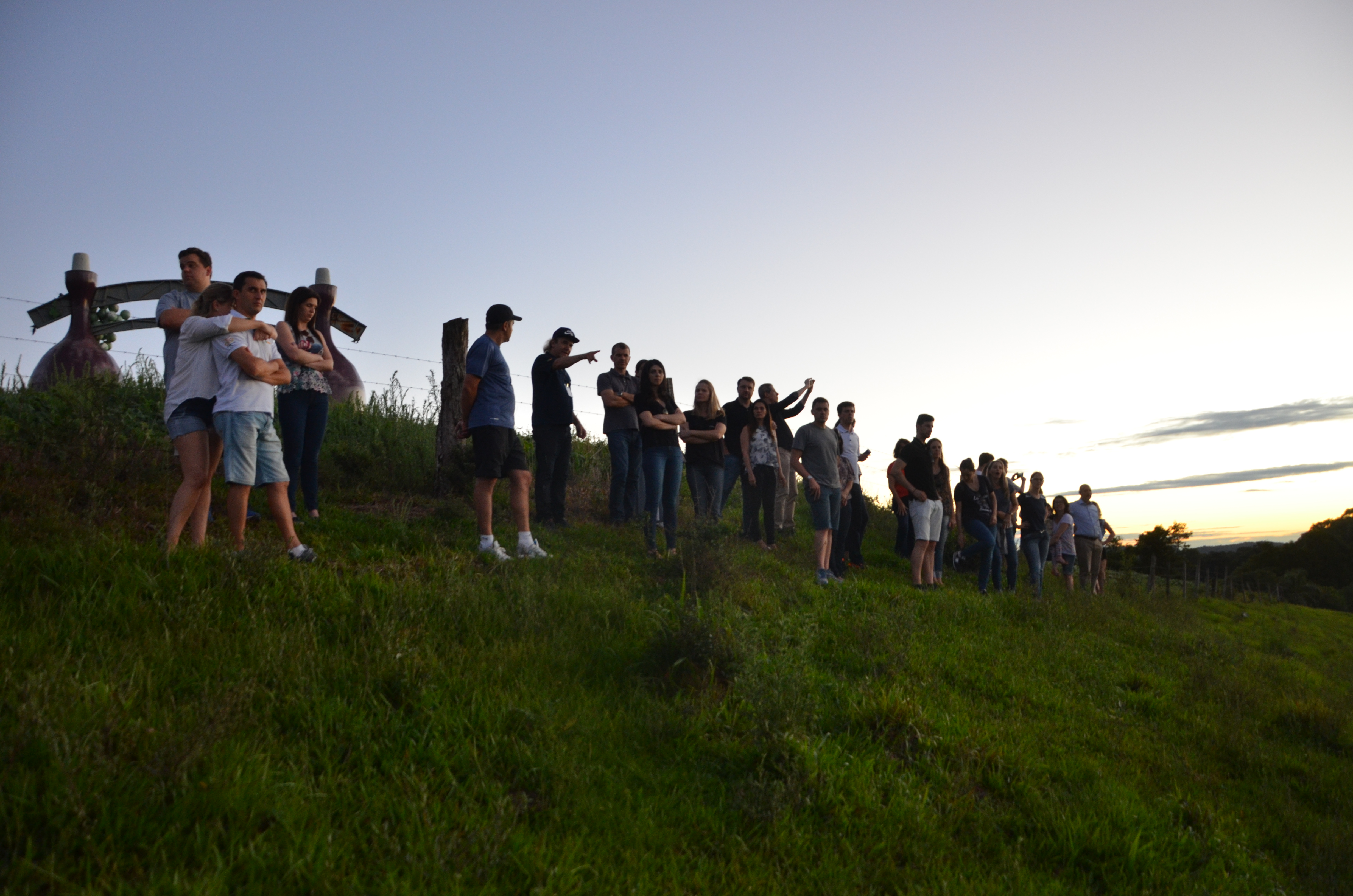 Ao chegar no local, o ônibus estaciona na estrada e os participantes do passeio se deslocam a pé até o ponto mais alto do morro, onde também está instalado um pórtico formado por duas garrafas e cachos de uva. Já é quase noite, mas ainda assim é possível visualizar toda a paisagem ao redor, enquanto o sol ainda não se põe por completo. Lá de cima, o guia Walmor convida todos a participarem do que já é um ritual do passeio: o chamamento ao Bacco, deus italiano do vinho.