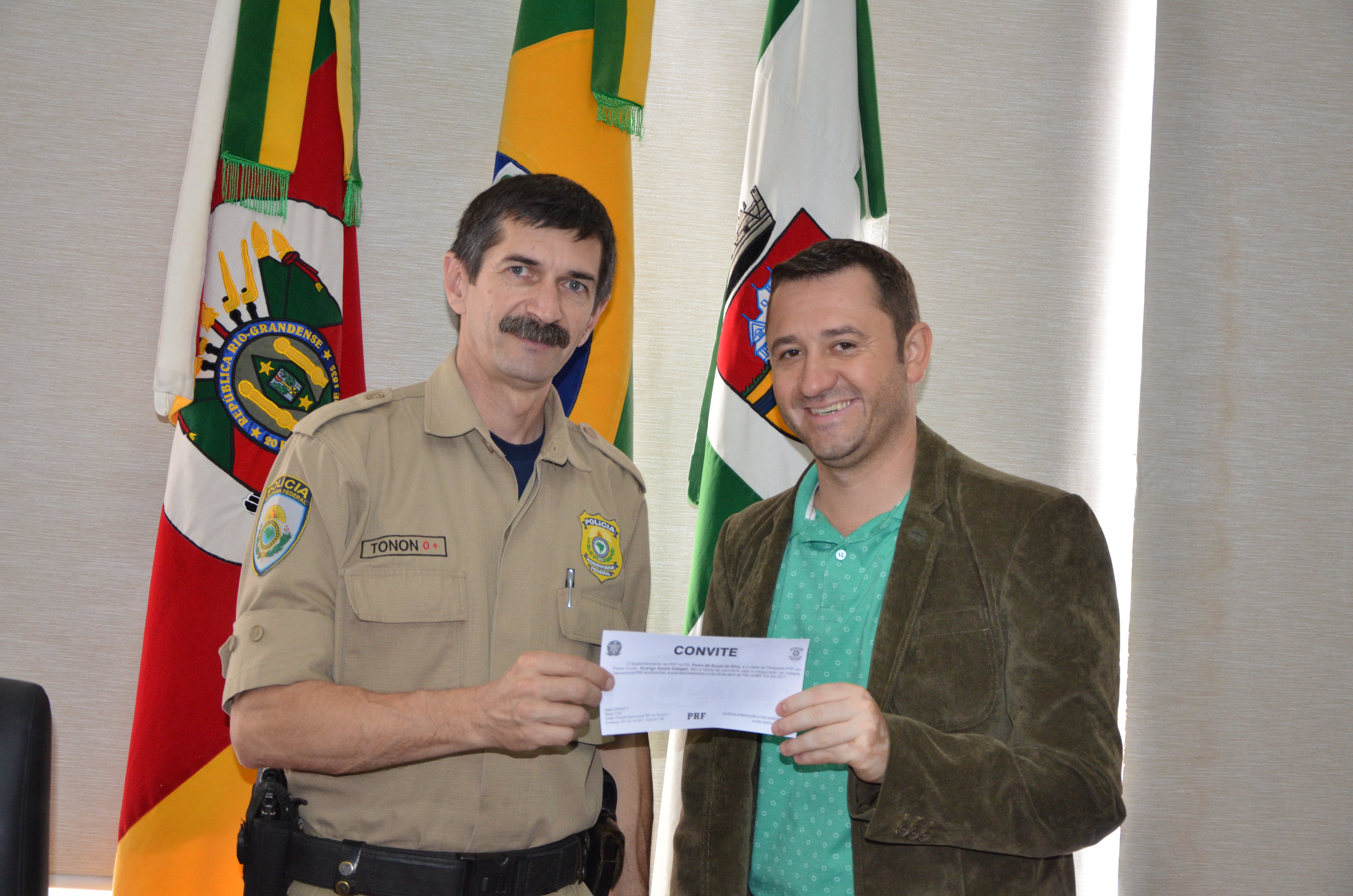 O presidente do poder Legislativo, vereador Ale Dal Zotto (PSB) recebeu, na manhã desta segunda (17), na sala da presidência, o chefe do Posto da Polícia Rodoviária Federal, Regivaldo Tonon, momento em que fez a entrega de um convite para a inauguração da unidade operacional. O ato ocorre na próxima quinta-feira, dia 20, às 10h no Km 38,7 na BR 153 e contará com a presença do superintendente da PRF do Estado, Pedro de Souza e Silva.
