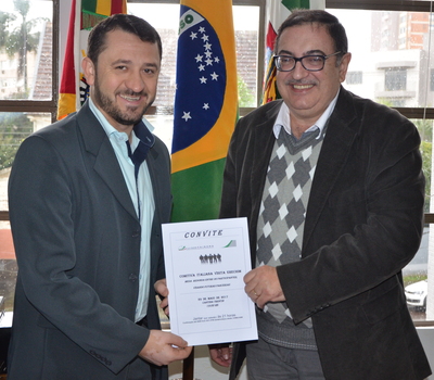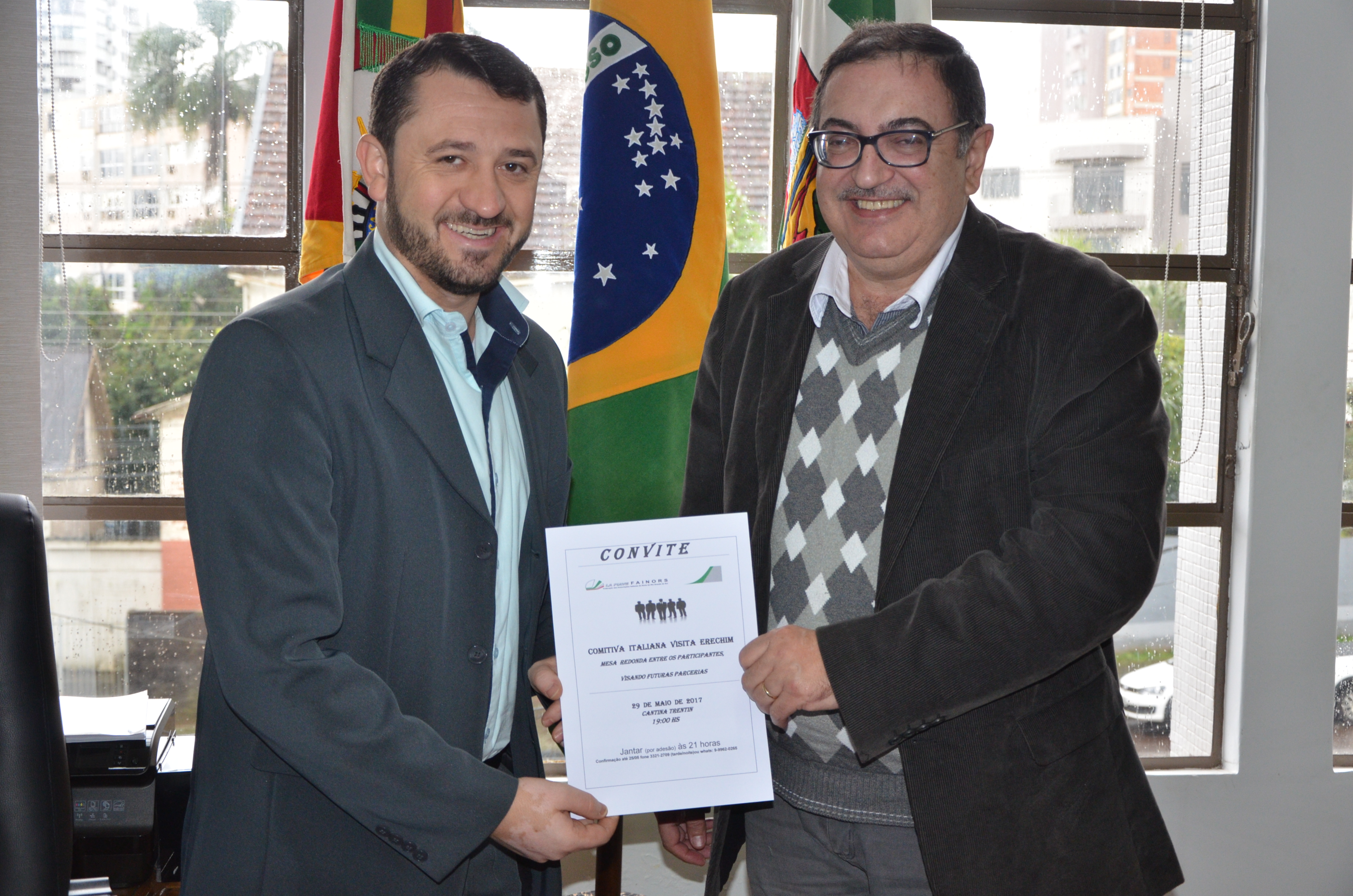 O presidente do poder Legislativo recebeu, nesta quarta, junto a sala da presidência, através de Aloir Castilhos, da La Plave Fainors, o convite para participar da chegada da comitiva italiana que visita o município de Erechim no próximo dia 29, a partir das 19h, na Cantina Trentin.