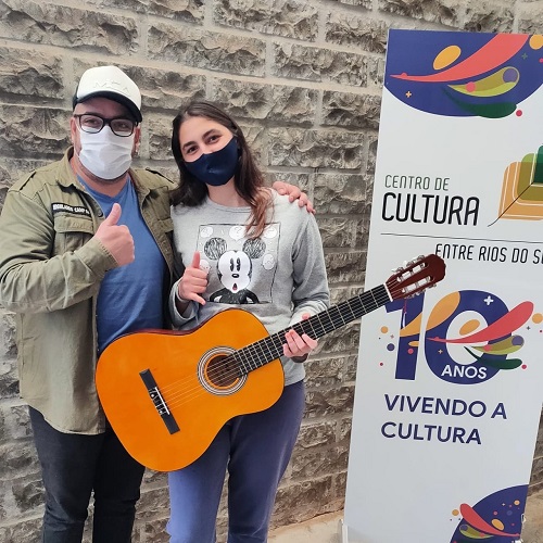 Dando continuidade as comemorações dos seus 10 anos, ainda no início do mês o Centro de Cultura de Entre Rios do Sul realizou a entrega dos brindes sorteados aos alunos na live comemorativa que aconteceu no dia 7 de julho deste ano. Os alunos premiados receberam os instrumentos musicais (violino, pandeiro, violão, guitarra, teclado e ukulelê) e que serão um grande auxílio na sua formação artística.
