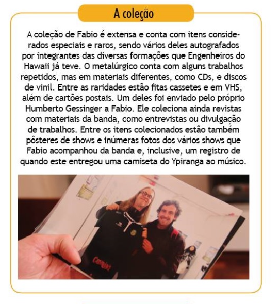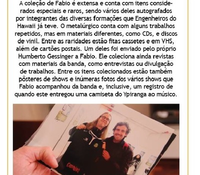Com uma vasta coleção que inclui além de discos de vinil, fitas cassetes e VHSs, CDs, revistas, pôsteres, quadros entre outros itens, Fábio acompanha a banda há uma década e meia. O carinho por Engenheiros do Hawaii lhe trouxe também várias amizades, motivadas pelo apreço em comum pela música. “Criamos grupos para combinarmos, nos encontramos em shows, trocamos materiais. É uma amizade que surgiu pelo fato de sermos fãs da mesma banda”, relata, enfatizando que tem amigos de vários locais do Brasil.