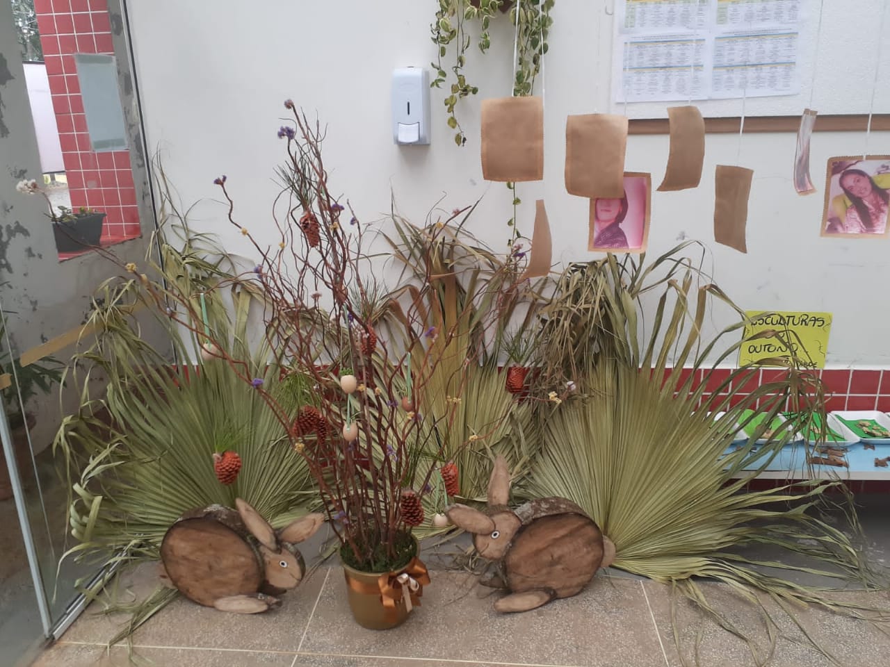 Para a decoração de Páscoa na escola, foram utilizados diversos elementos característicos da época, como cascas de ovos, arbustos, chás e troncos de árvores (que já estavam caídos) — compondo um cenário alegre, atrativo e sem agredir o meio ambiente.