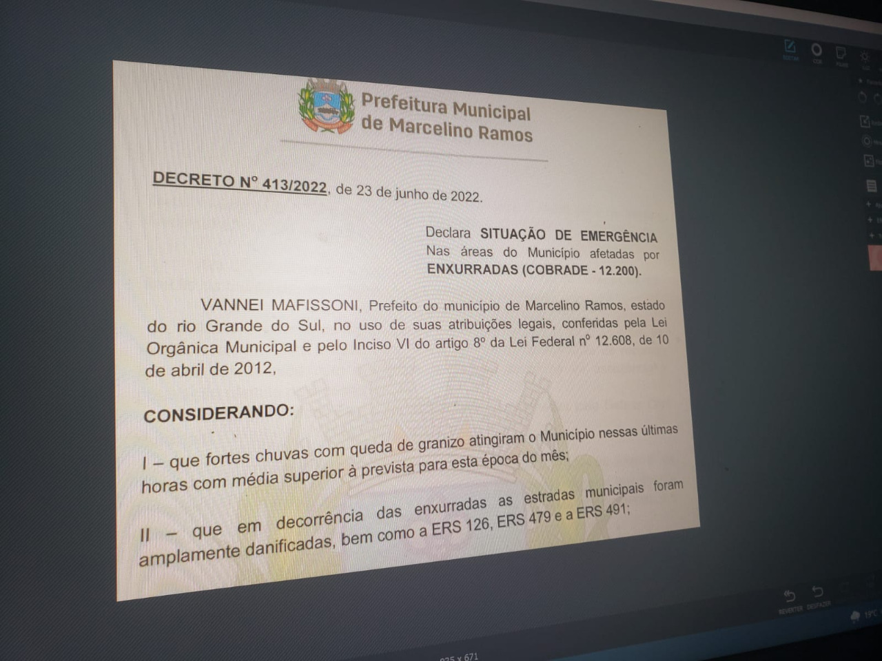 O prefeito de Marcelino Ramos, Vannei Mafissoni, que tem acompanhado de perto os prejuízos provocados pelo temporal, publicou na tarde desta quinta-feira (23) um decreto de situação de emergência nas áreas afetadas pela enxurrada. As fortes chuvas com queda de granizo atingiram o município com média superior à prevista para esta época. Várias estradas municipais foram danificadas, bem como a ERS 126, ERS 479 e a ERS 491.