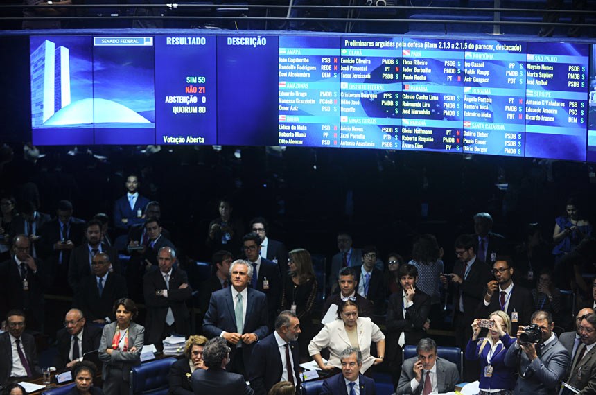 Antes da votação do parecer, o Senado teve que decidir sobre questão preliminares colocadas pela defesa de Dilma que foram votadas agrupadas em um destaque. Segundo o presidente da sessão, ministro Ricardo Lewandowski, as preliminares devem ser votadas primeiro, para não prejudicar o mérito do parecer.
