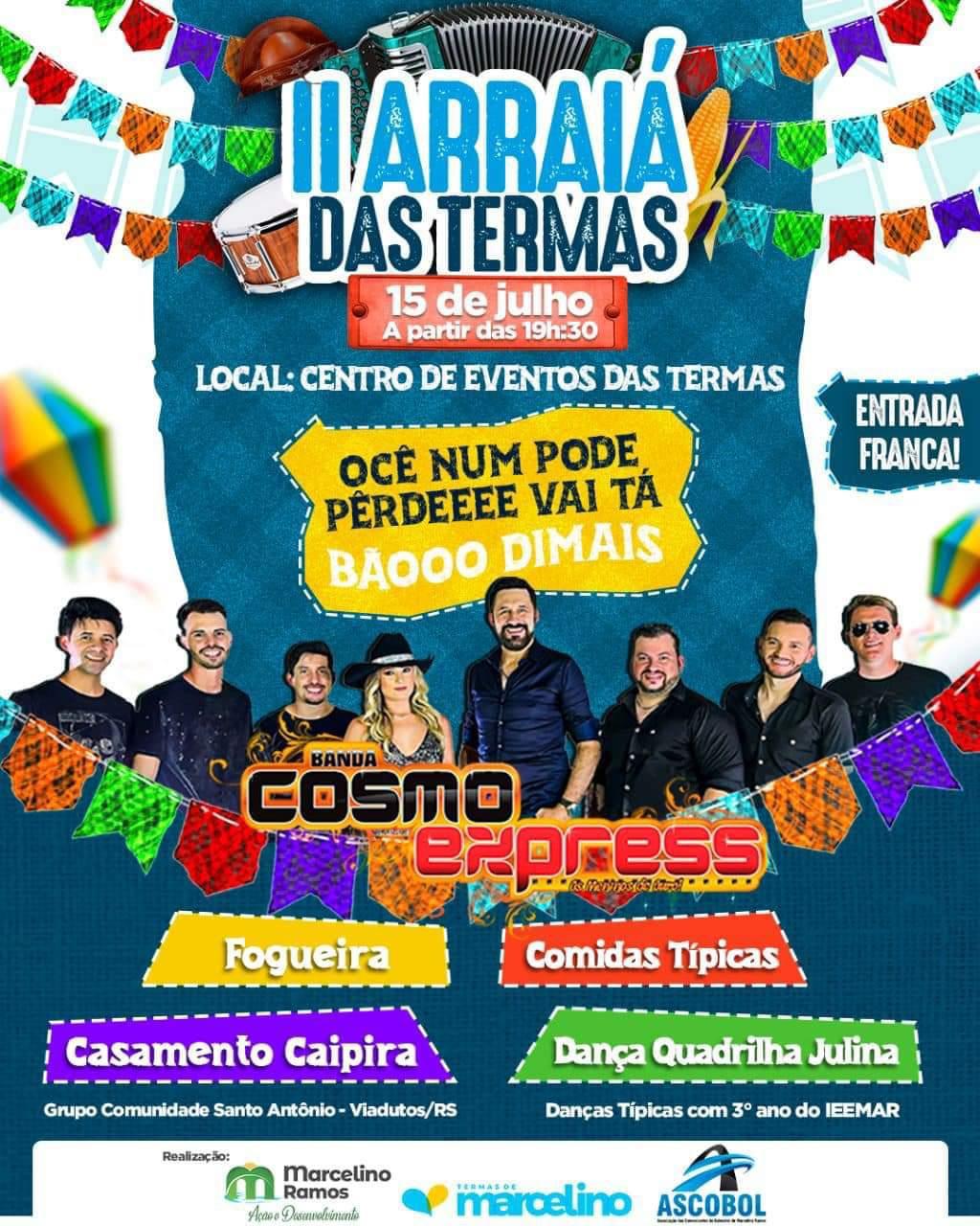 No próximo dia 15 de julho, o Centro de Eventos das Termas de Marcelino Ramos será transformado em um autêntico e animado Arraiá. Esta será a segunda edição do tão aguardado Arraiá das Termas, que promete encantar moradores e visitantes com muita diversão e cultura. E o melhor de tudo: a entrada será gratuita para todos!