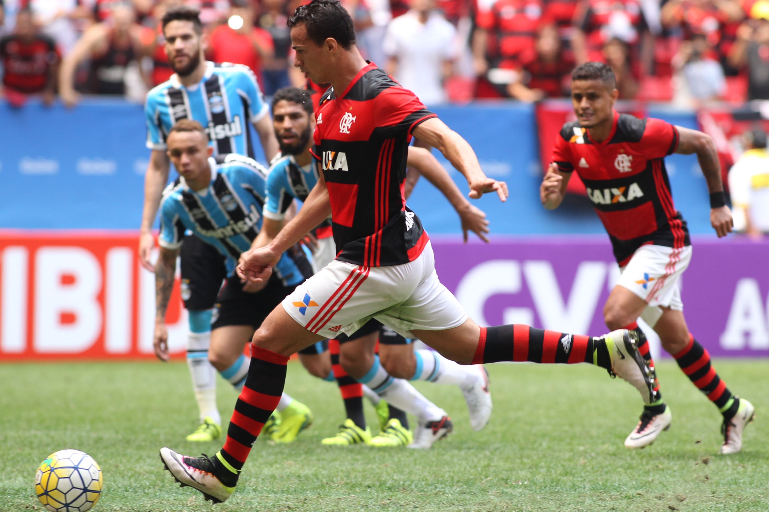Jogando no estádio Mané Garrincha, em Brasília, hoje pela manhã, o tricolor perdeu para o Flamengo por 2 a 1 e desperdiçou a oportunidade de se aproximar do líder Palmeiras. A derrota fez o Grêmio sair do G4 do Campeonato Brasileiro, estacionando nos 35 pontos, em quinto lugar, embora tenha um jogo a menos.