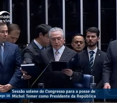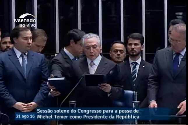 O plenário do Congresso Nacional acaba de dar posse a Michel Temer como presidente da República. Ele já estava no cargo interinamente desde o afastamento de Dilma Rousseff por consequência da abertura do processo de impeachment dela, em maio deste ano. A posse foi dada pelo presidente do Congresso, Renan Calheiros (PMDB-AL).