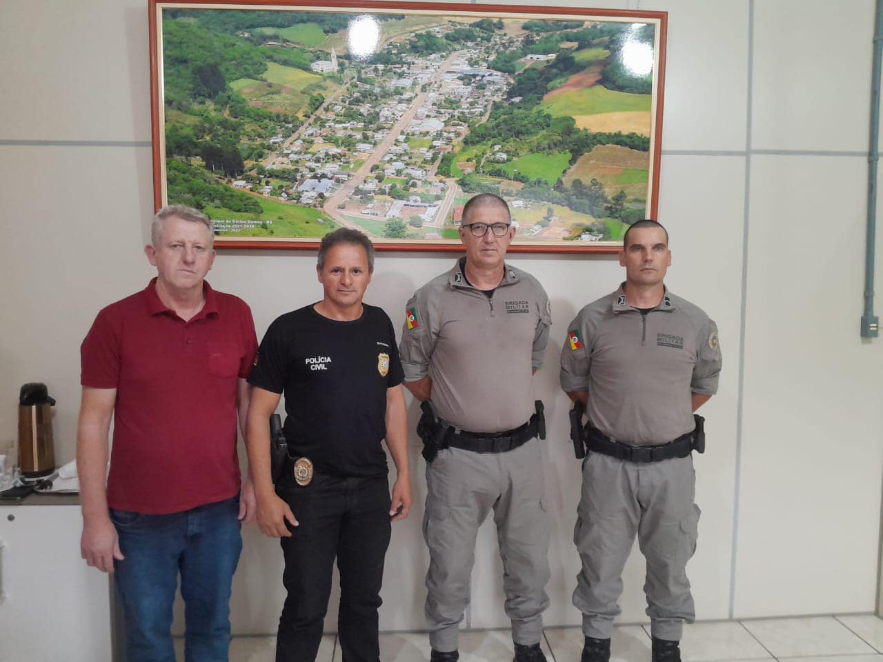 O prefeito municipal, Luiz Zelinski, reuniu-se em uma importante reunião com representantes da Brigada Militar e da Polícia Civil para discutir medidas de segurança pública na cidade. O encontro contou com a presença do 2° Sgt Jaisson Calderoli, Cmt Do 5 Pel De Gaurama e do Sd Jocemar Rudnitski, Cmt do 3° GPM de Carlos Gomes da Brigada Militar e o Delegado Germano Alves de Lima da Polícia Civil.