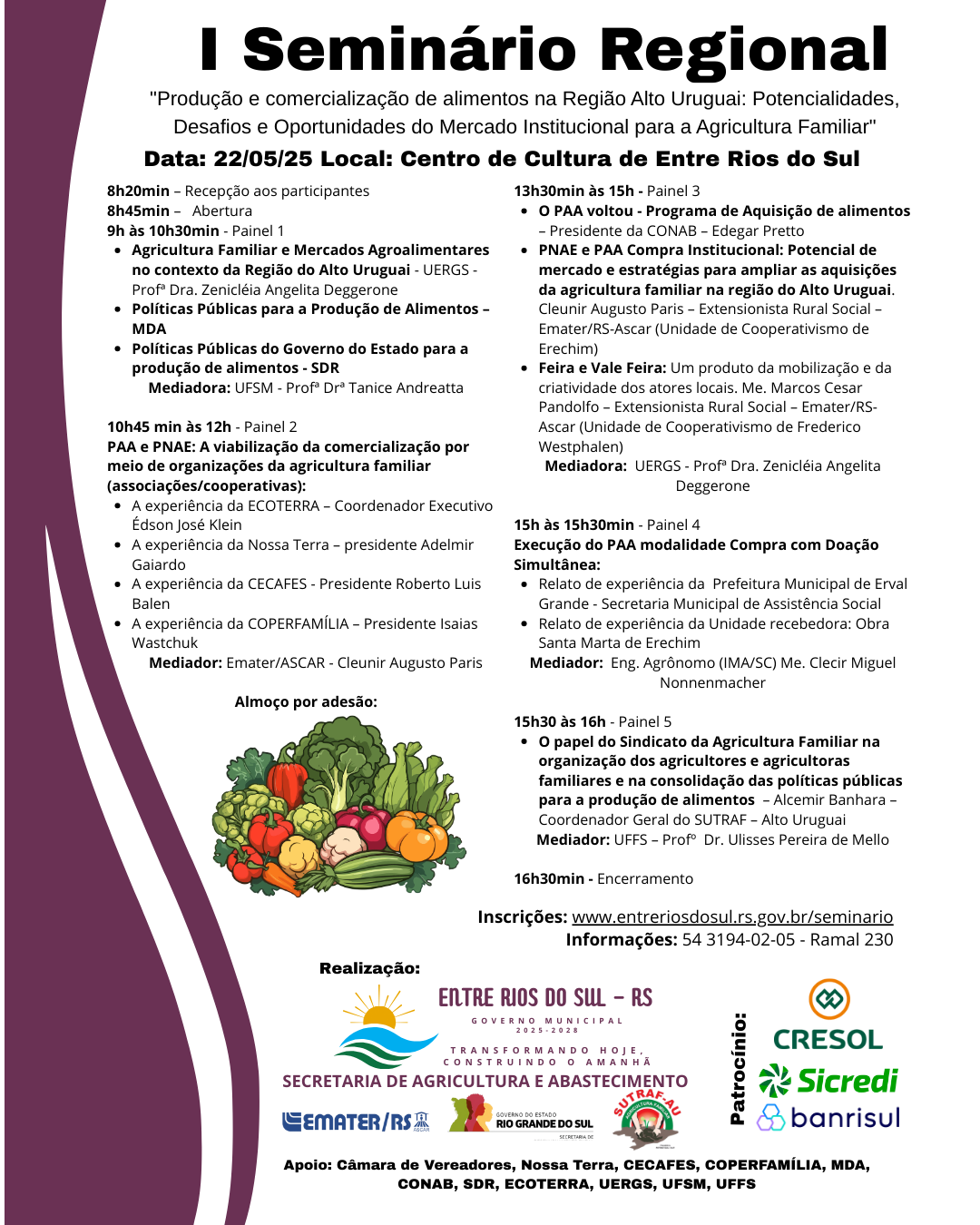No próximo dia 22 de maio de 2025, o município de Entre Rios do Sul será palco do I Seminário Regional sobre Produção e Comercialização de Alimentos na Região Alto Uruguai, com o tema: "Potencialidades, Desafios e Oportunidades do Mercado Institucional para a Agricultura Familiar". O evento acontecerá no Centro de Cultura e reunirá especialistas, autoridades, representantes de cooperativas, associações e agricultores familiares de toda a região.