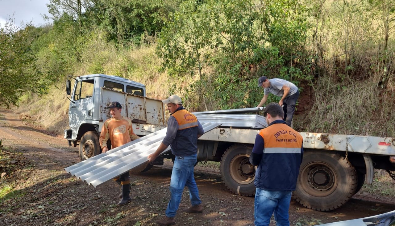 As equipes da Defesa Civil junto com integrantes da Administração Municipal realizaram a distribuição de lonas emergenciais no primeiro momento. Nesta quinta-feira (05), foram entregues telhas de fibrocimento (brasilites) para auxiliar na recomposição das coberturas das residências atingidas.