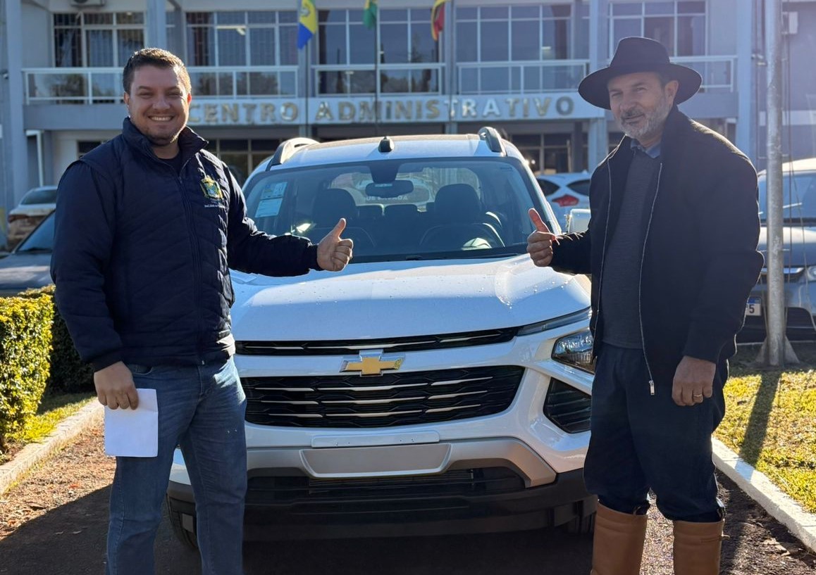 O prefeito de Faxinalzinho, James Ayres Torres, ao lado do secretário de Saúde, Júlio César Pires Luz, receberam, oficialmente, um novo veículo, zero quilômetro, que vai integrar a frota da Secretaria Municipal de Saúde.