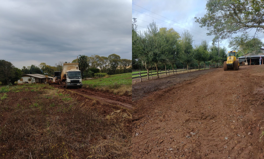 Na Linha Souza, foi concluído o cascalhamento de um trecho que necessitava de melhorias para garantir melhor trafegabilidade, especialmente em dias de chuva. Já na Linha Narzeti, os trabalhos se concentraram no pátio de uma residência, com a colocação de tubulação para melhorar o escoamento da água, atendendo a uma demanda dos moradores locais.