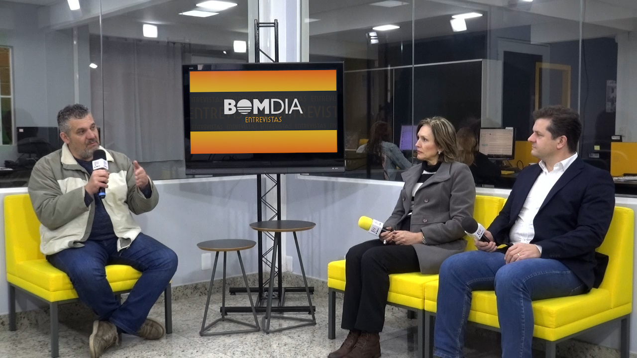 Legenda: Leandro Pogorzelski e Márcia Santin durante entrevista com Rodrigo Finardi na TV Bom Dia