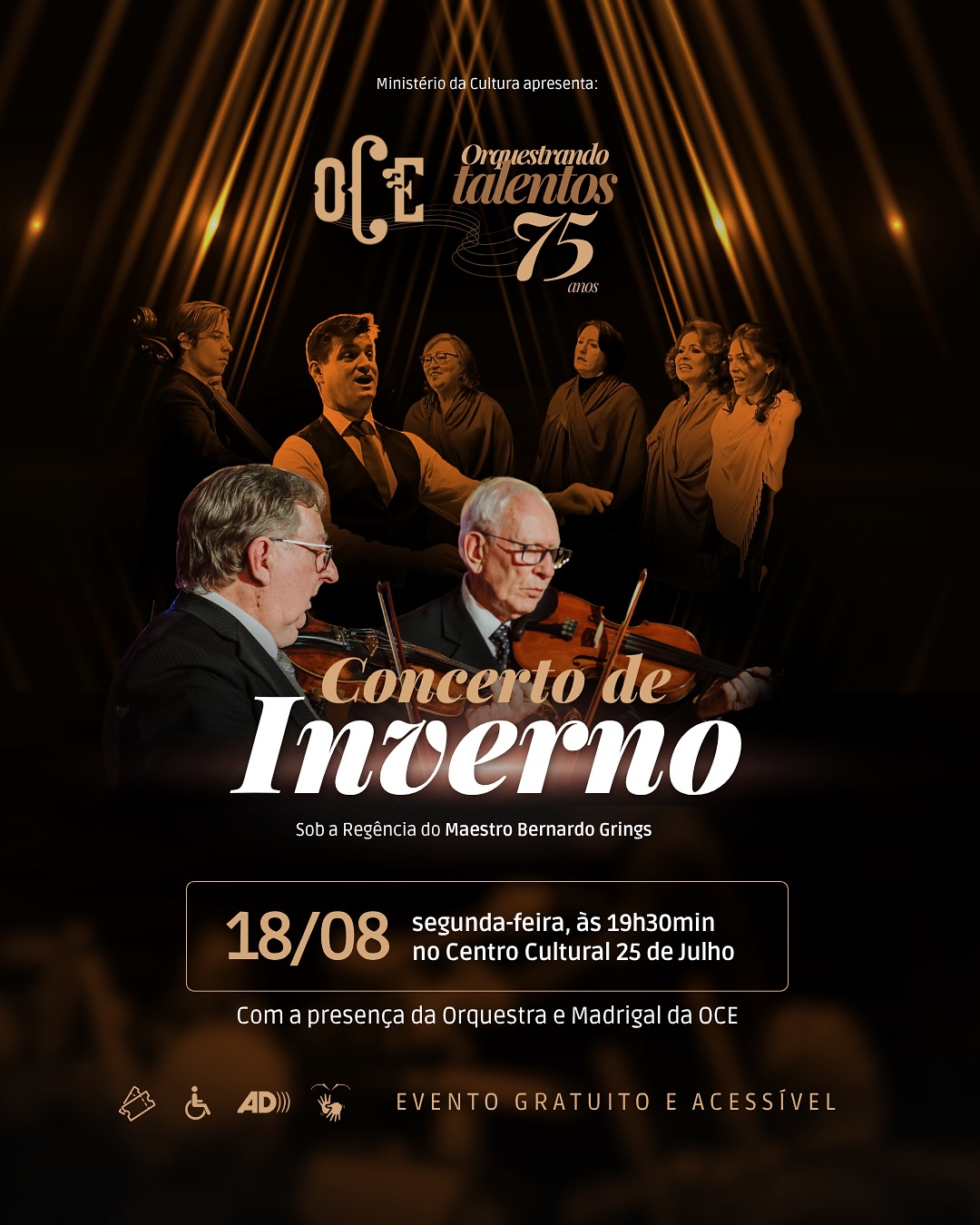O concerto integra o projeto “OCE – Orquestrando Talentos – 75 anos”, realizado através do Ministério da Cultura - Lei Rouanet, e conta com estrutura acessível, incluindo intérprete de Libras e monitores de acessibilidade.