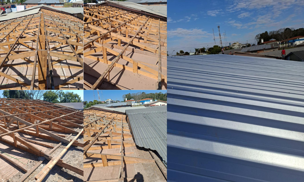 Na Escola Municipal de Educação Infantil Risinho, a cobertura em aluzinco semi-sanduíche substitui o material anterior, que apresentava infiltrações. Conforme a secretária Ieda Maria Argenta Uriarte, o cronograma de obras foi definido de modo a preservar a segurança dos estudantes.