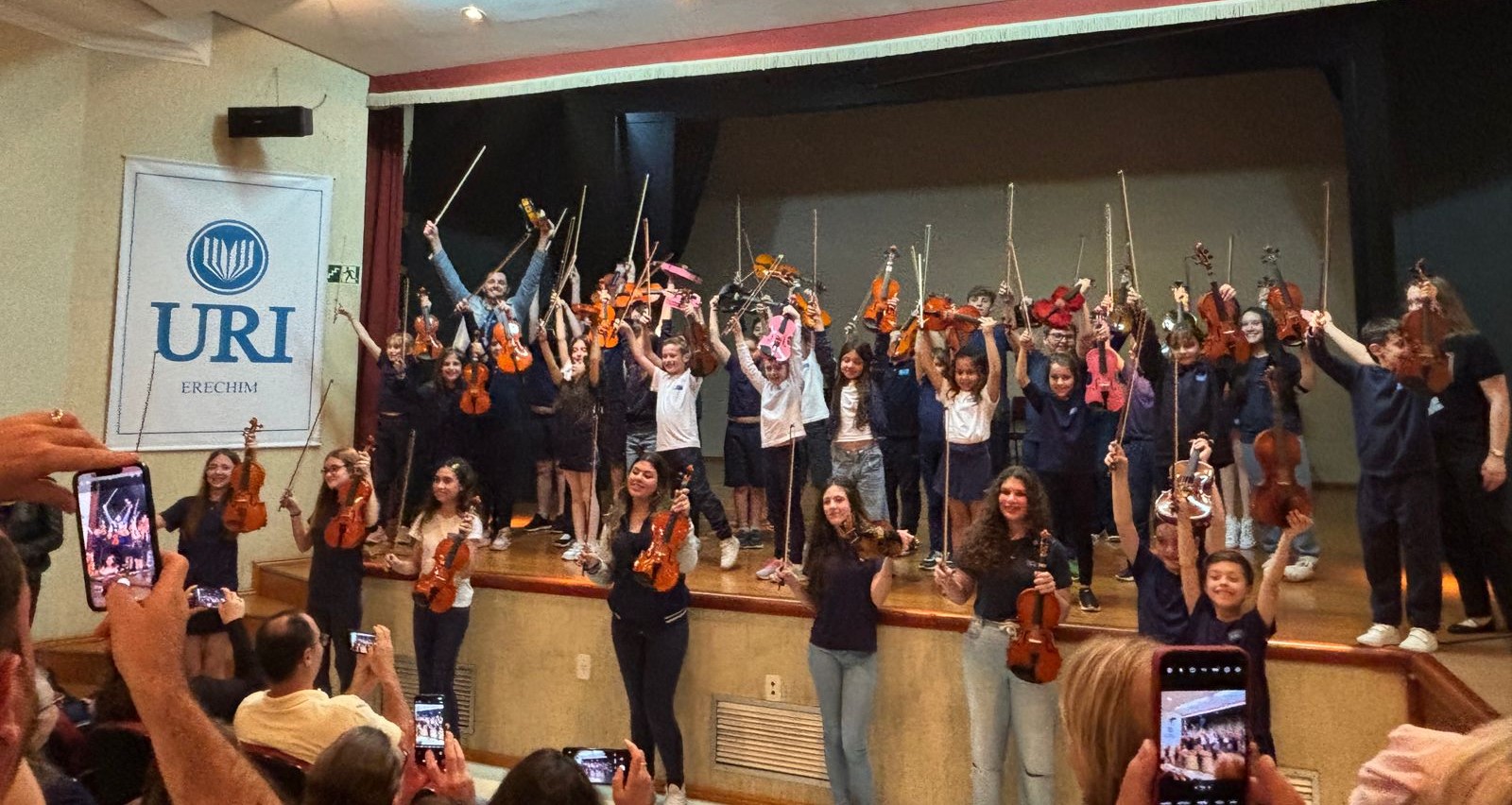Um dos momentos mais significativos da noite foi à apresentação no formato de orquestra, uma iniciativa que vem se fortalecendo na escola. O grupo incluiu não apenas os violinos, mas também instrumentos como violoncelo, violão e baixo.