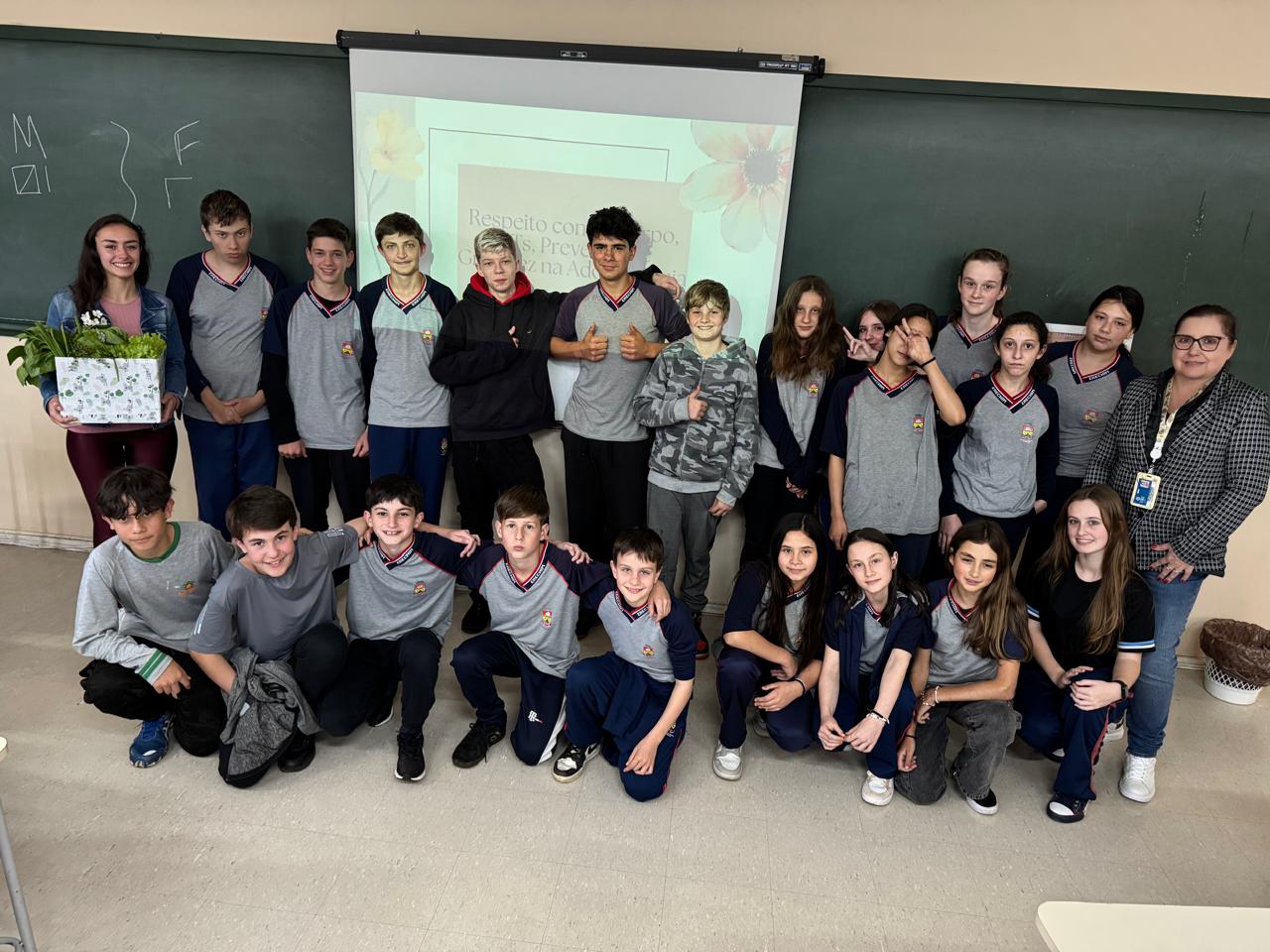 O encontro teve como foco o cuidado com o corpo, a prevenção de Infecções Sexualmente Transmissíveis (ISTs) e a gravidez na adolescência. A palestra foi conduzida pela enfermeira, doutora e professora Cibele Sandri Manfredine, do Curso de Graduação em Enfermagem da URI Erechim, com o apoio da acadêmica Maria Eduarda Rossetti Wengrzynek, estudante do 4º semestre de Enfermagem e bolsista voluntária do projeto de extensão ‘A prática acadêmica na orientação sobre saúde e projeto de vida para crianças e adolescentes no ambiente escolar’.