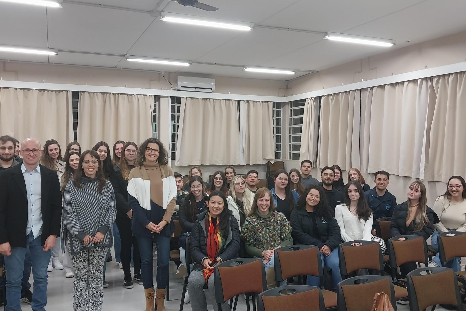 Acadêmicos do Curso de Arquitetura e Urbanismo da URI participaram na quarta-feira, 27, de uma palestra com o Diretor Executivo da Áttollo Elevadores, Fábio Brustolin. O encontro, que reuniu alunos das turmas de 2022, 2023 e 2025, foi conduzido pelas professoras Vanessa Tibola da Rocha e Roberta Grendene, com a presença dos docentes Darllan Fabiani da Silva Santos, Ivana Karine Aver e Natália Nakadomari Bula.
