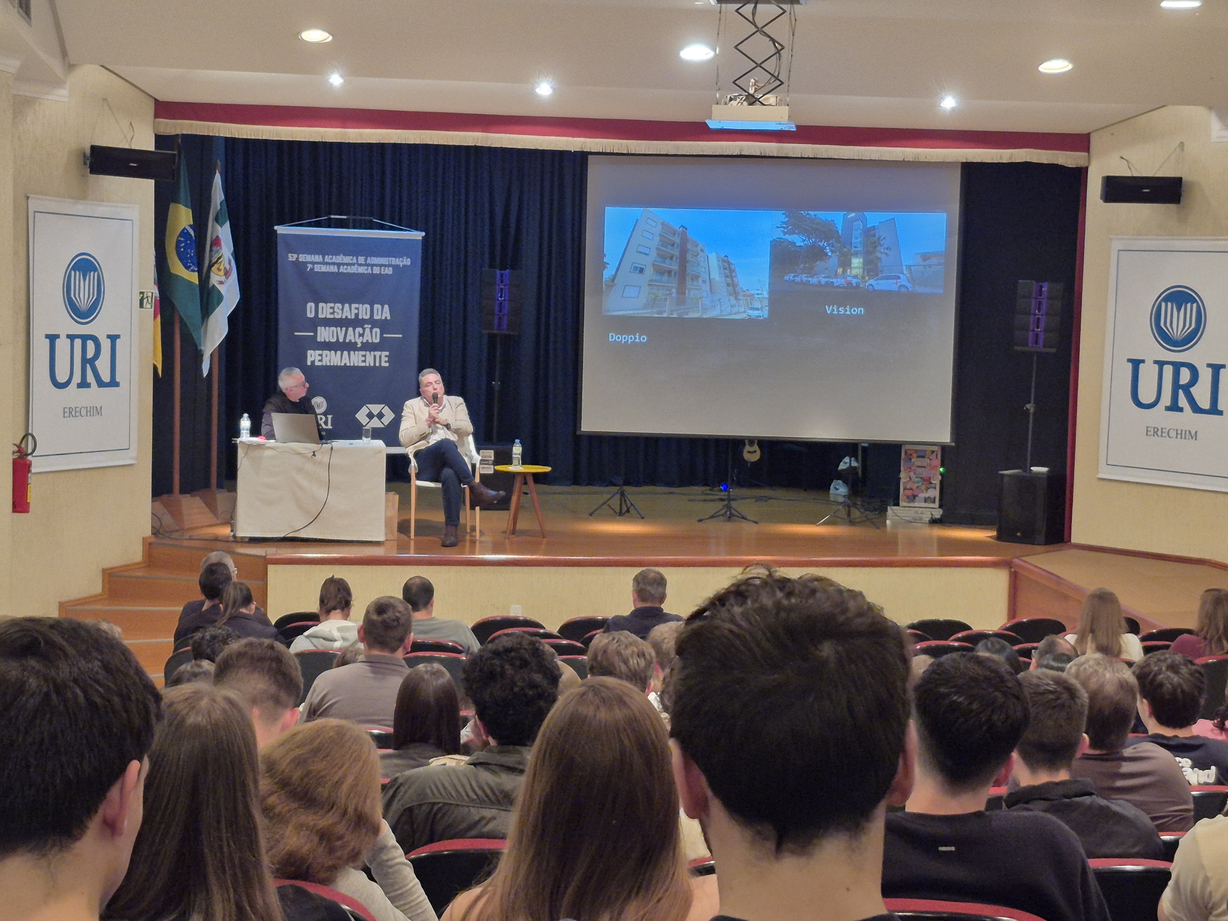 Na noite de terça-feira, 2, a Semana de Administração da URI Erechim promoveu um Talk Show no Auditório do Prédio 8, como parte da programação da 53ª Semana Acadêmica. O formato, inspirado em programas de entrevistas, buscou aproximar convidados e público em uma conversa descontraída, mesclando música, reflexões profissionais e trajetórias de vida.