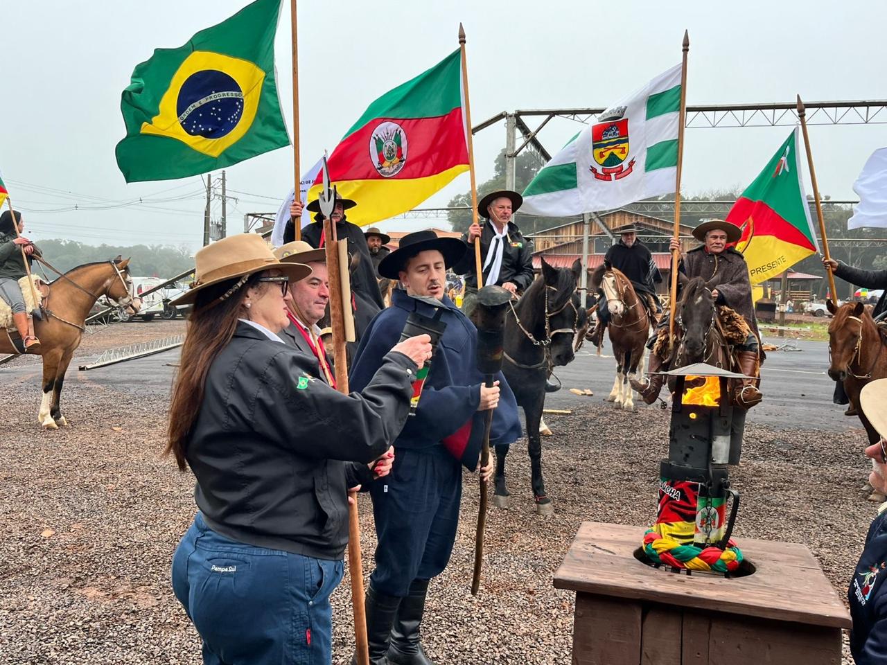 Na manhã de sábado (6), uma cerimônia simbólica importante para os tradicionalistas aconteceu no Centro Municipal de Eventos e Tradições Gaúchas Zulmir José Sotoriva: a fusão da Chama Crioula 2025 com a Chama Itinerante 2025 para distribuição para 34 municípios da 19ª Região Tradicionalista (RT) do Movimento Tradicionalista Gaúcho (MTG), darem início aos Festejos Farroupilhas 2025.