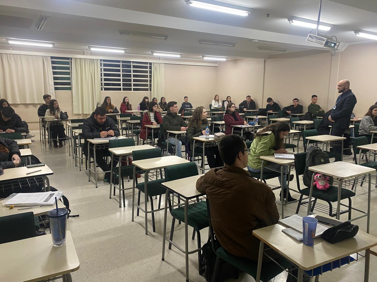 Acadêmicos do 4º semestre, do Curso de Direito da URI Erechim, diurno e noturno, participaram na sexta-feira, 5, de um importante momento de formação e reflexão por meio da disciplina de Projeto Integrador II. A atividade contou com a presença do professor Ricardo Pasini, que ministrou a palestra “Direitos e Deveres na Constituição Federal Garantidora”, com foco nas garantias fundamentais e nos direitos humanos.