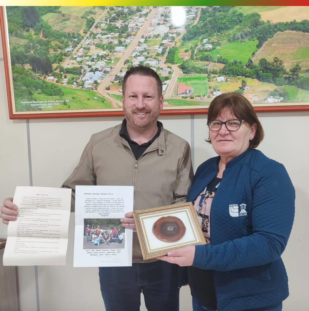 O prefeito de Carlos Gomes, Hermes Antonio Paris, recebeu uma lembrança especial como forma de agradecimento pelo incentivo à participação do grupo de Carlos Gomes e Áurea no 3º Fórum de Paisagismo e Turismo Rural, promovido nos dias 9 e 10 de setembro em Ametista do Sul.