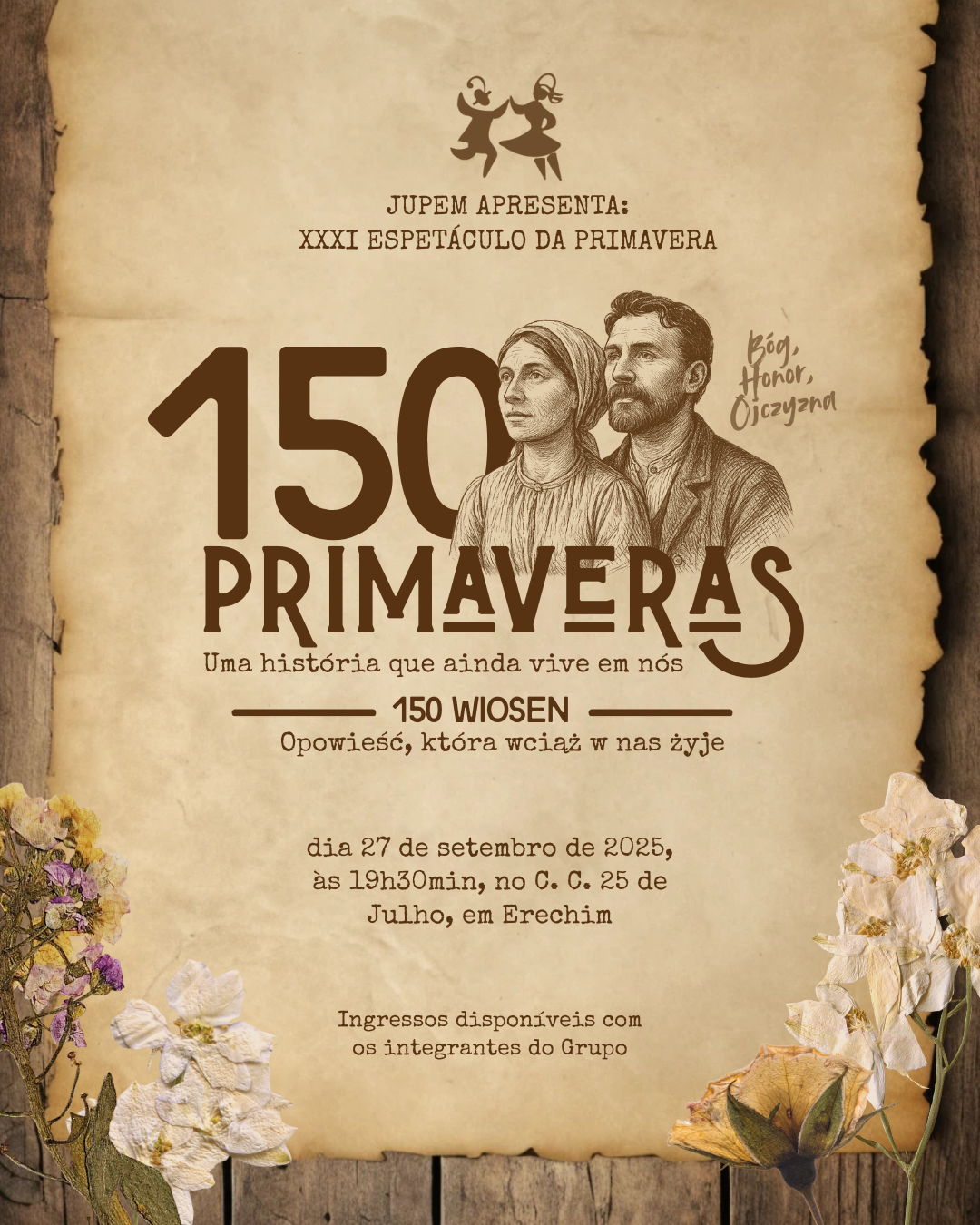 Em 2025, o Grupo Folclórico Polonês de Erechim JUPEM celebra uma data histórica e simbólica para a comunidade local e para o Rio Grande do Sul: os 150 anos da imigração polonesa no estado. Para marcar essa trajetória, o tradicional Espetáculo da Primavera traz ao palco o tema “150 primaveras – Uma história que ainda vive em nós” (em polonês, “150 wiosen – Opowieść, która wciąż w nas żyje”).