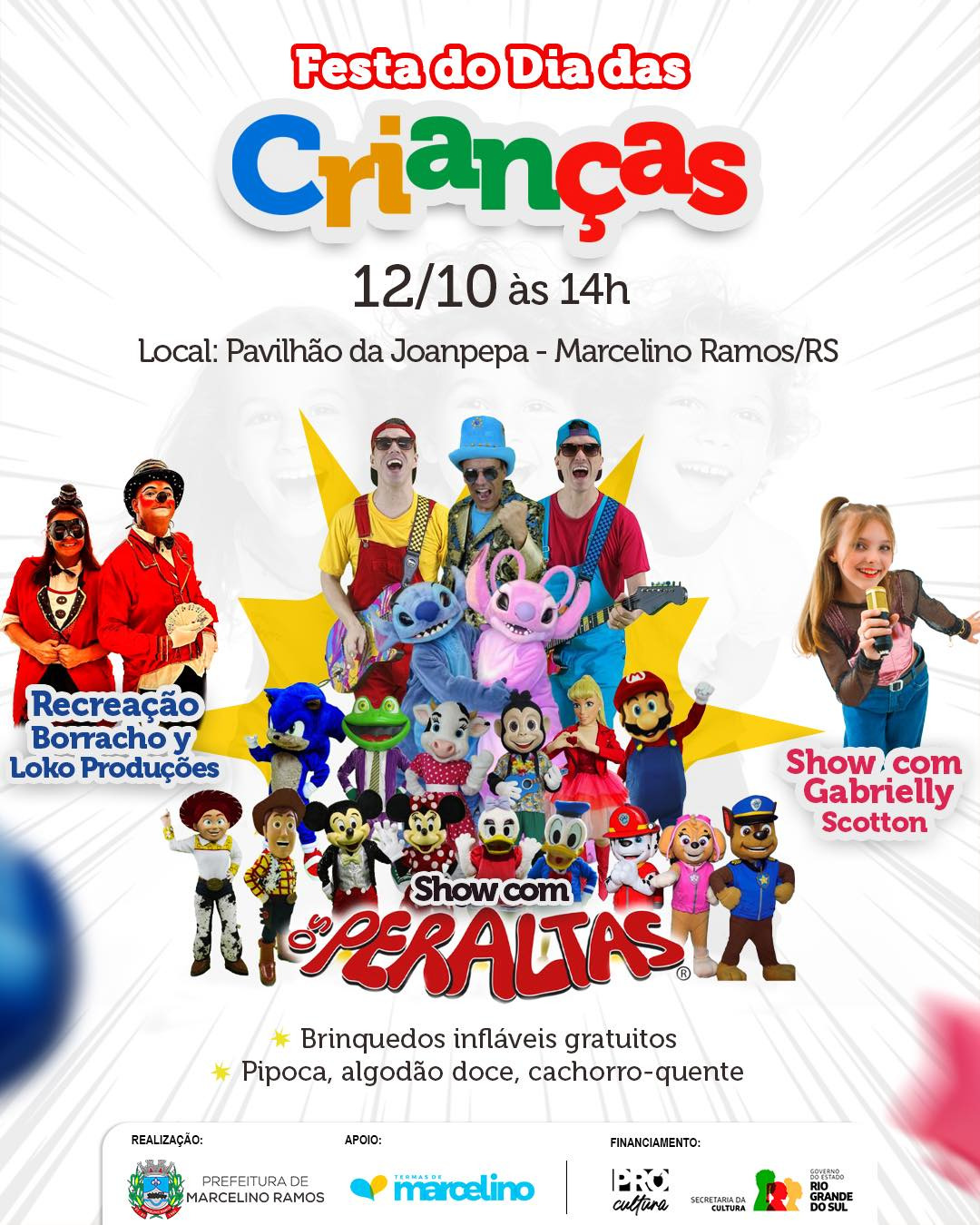 A Administração Municipal de Marcelino Ramos divulgou a programação deste ano em comemoração ao Dia das Crianças. O evento está marcado para 12 de outubro, a partir das 14h, no Pavilhão da Joanpepa, com entrada gratuita e atrações voltadas ao público infantil e familiares.