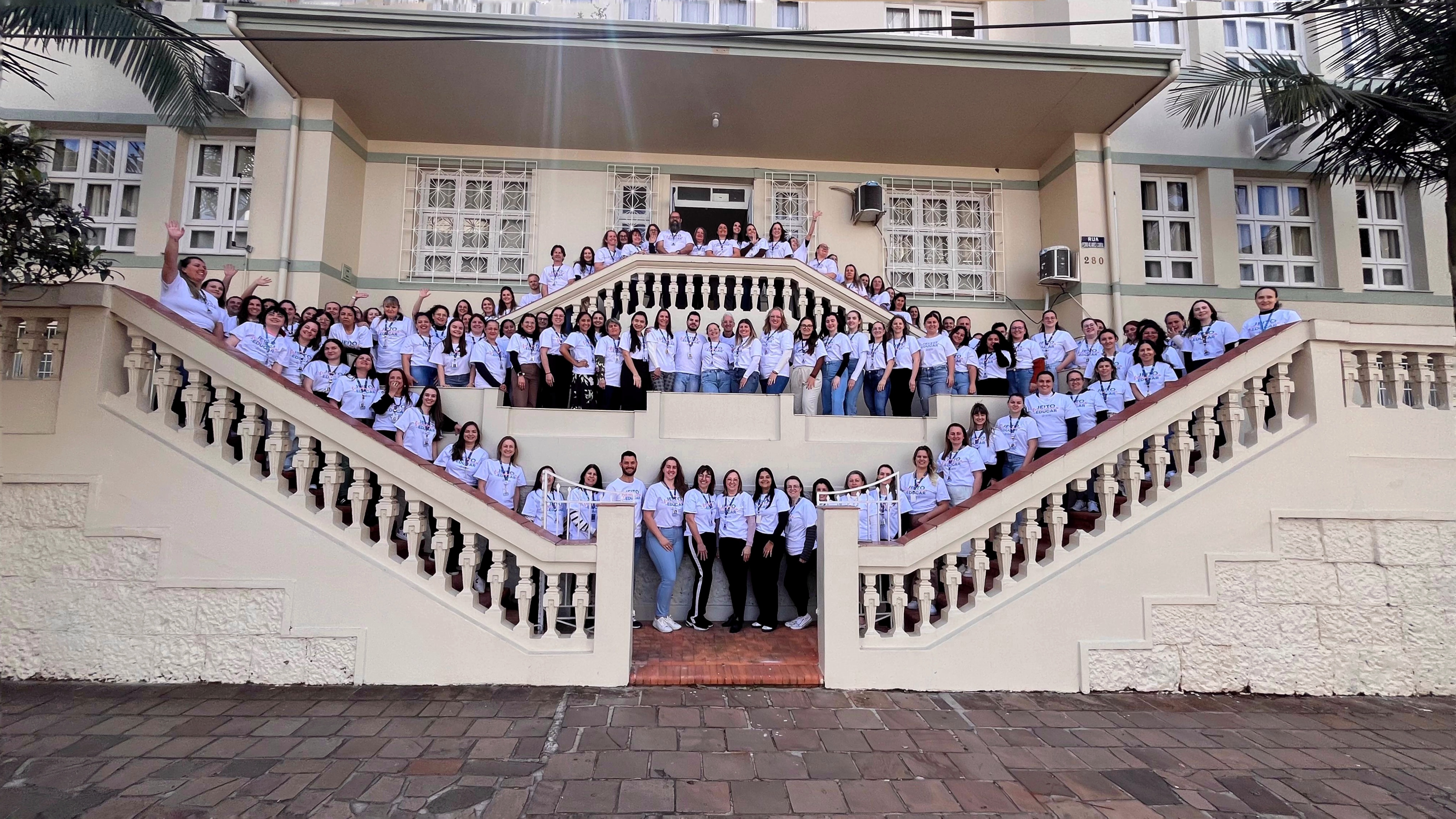 Na sequência, as comunicadoras Adrielli Piccim e Vitória Lombardi Cavalheiro apresentaram a identidade visual e os conceitos da campanha de matrículas 2026, baseada no trinômio “Imaginar, Criar e Transformar”. Vitória, ex-aluna e hoje profissional da área de comunicação, emocionou-se ao falar da própria experiência. “Tudo o que a Irmã Vera falou eu percebo que vivi no colégio. A experiência franciscana marcou minha formação e é o que me trouxe de volta como profissional”, relatou.