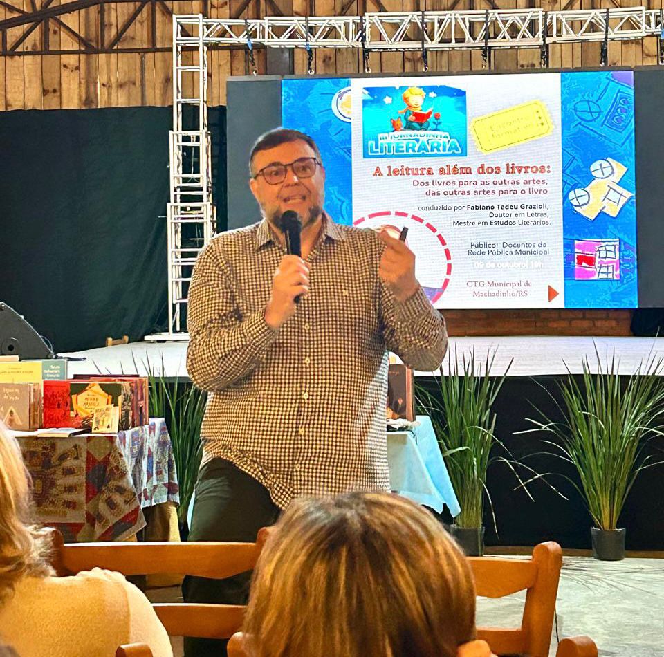 No turno da noite, na quinta-feira, dia 09.10, Fabiano Tadeu Grazioli, da Dueto Produções Culturais e Artísticas Ltda., realizou uma palestra para os professores da rede pública municipal, dentro da programação da III Jornadinha Literária de Machadinho/RS.