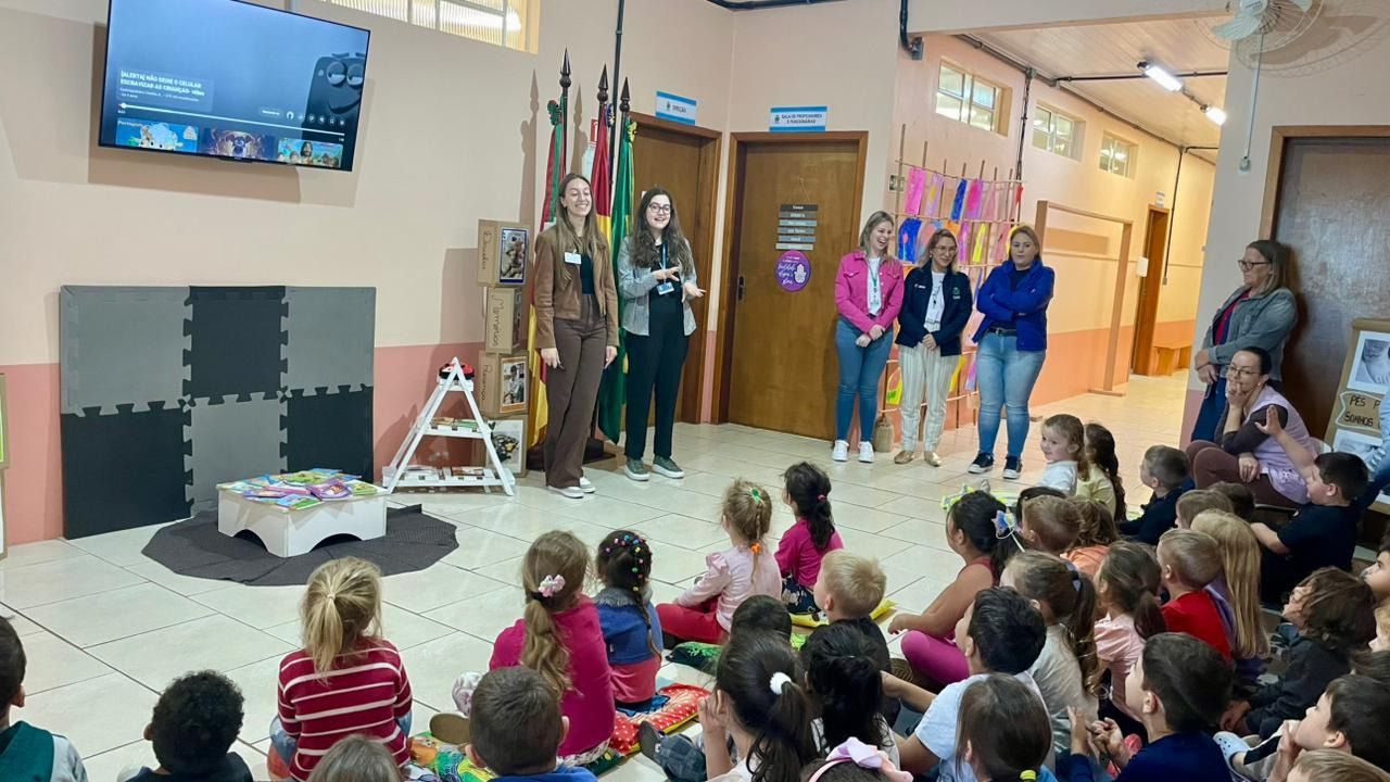 No encontro, as estudantes apresentaram dados sobre as etapas do desenvolvimento humano e o uso da tecnologia, reforçando os impactos que o uso indiscriminado de telas pode ter no desenvolvimento cognitivo, social e emocional.
