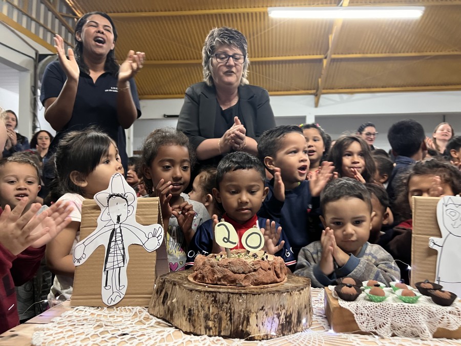 Durante a atividade, Joemir compartilhou com as crianças suas vivências e o amor pela escrita, envolvendo os pequenos em um universo de imaginação e descobertas. Após a contação de histórias, estudantes, professores, famílias e convidados se reuniram para cantar parabéns à escola, celebrando duas décadas de dedicação à Educação Infantil.