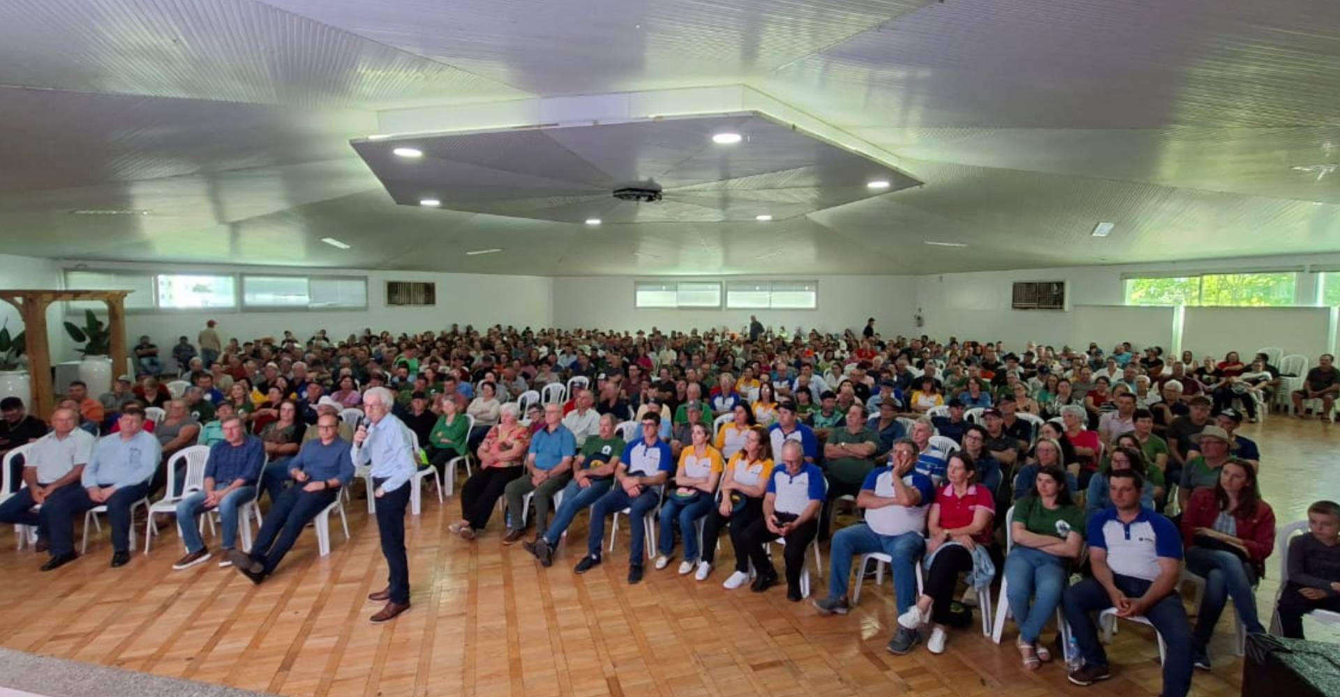 Neste ano, foram 22 reuniões que reuniram 8.681 participantes. Na imagem acima, um registro feito na regional de Xaxim, onde 507 cooperados marcaram presença. O objetivo foi repassar as principais informações da gestão da cooperativa principalmente referente a 2025, como: números das regiões administrativas (recebimento de produção, receitas, despesas, sobras, número de associados, colaboradores), valores relacionados ao capital social, e ainda, perspectivas de mercado no agronegócio e principais investimentos realizados e a realizar por parte da cooperativa, entre outros assuntos.
