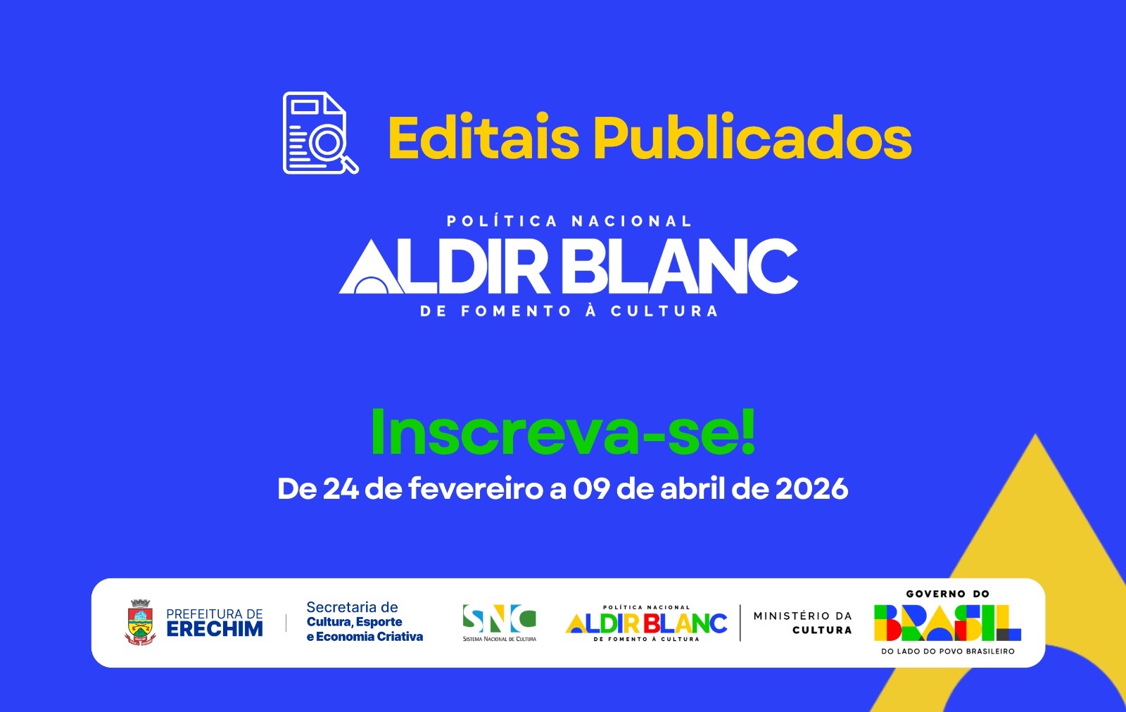 A Prefeitura de Erechim, através da Secretaria Municipal de Cultura, Esporte e Economia Criativa, está com inscrições abertas para três editais municipais da Política Nacional Aldir Blanc de Fomento à Cultura (PNAB), que destinarão recursos significativos para o fortalecimento das iniciativas culturais no município. Ao todo, são 26 vagas distribuídas entre projetos culturais, premiação de Pontos de Cultura e fomento a projetos continuados de Pontos de Cultura, contemplando diferentes perfis de agentes culturais e organizações. As diretrizes e temas dos editais foram definidos pelo Ministério da Cultura para orientar Estados e Municípios na criação dos editais locais do ciclo. O prazo de inscrições é de 24 de fevereiro até 9 de abril de 2026.