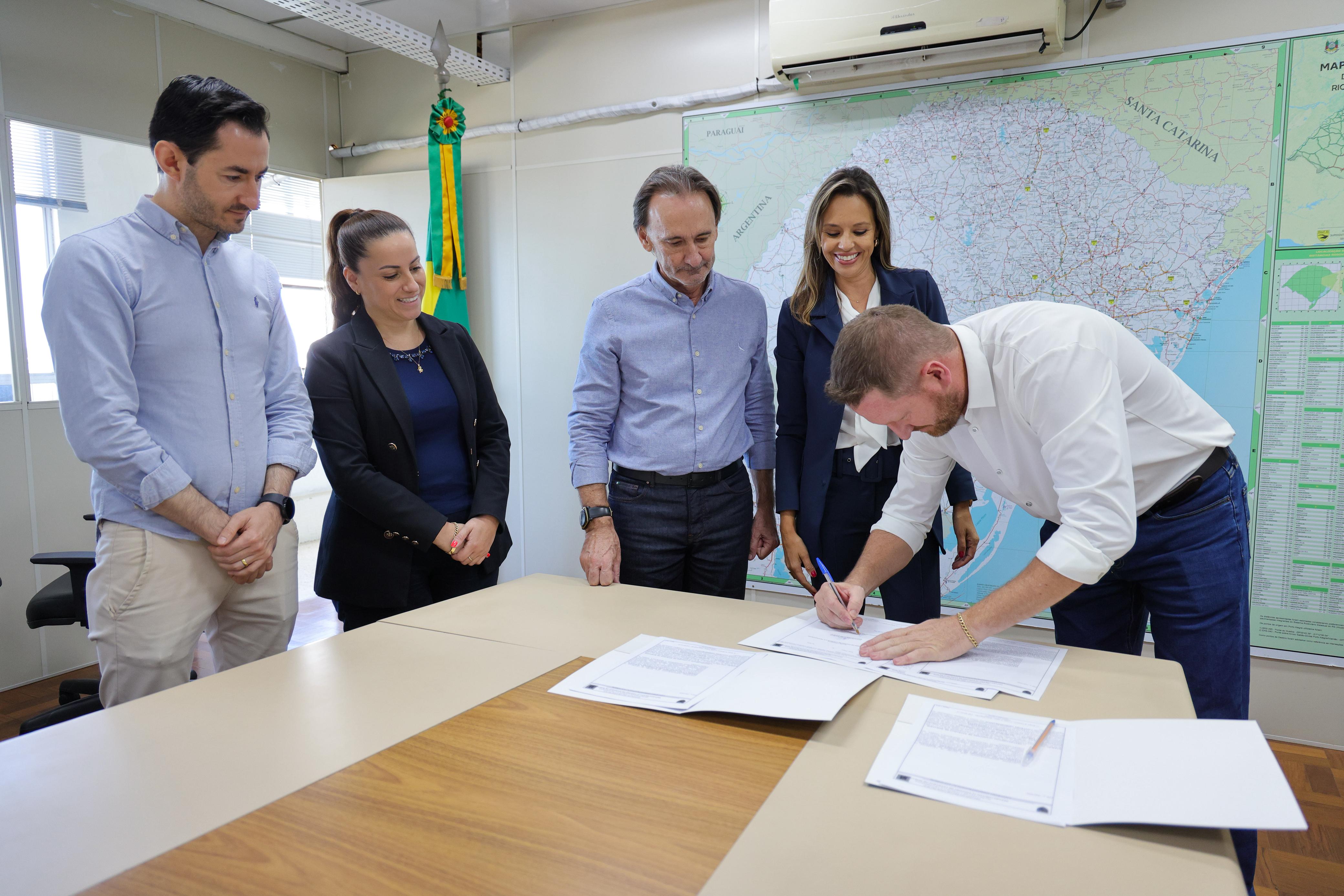 A assinatura de convênio para a execução de pavimentação asfáltica entre os municípios de Carlos Gomes e Centenário aconteceu na terça-feira, 31 de março, em ato que contou com a presença de autoridades estaduais e do Executivo de Carlos Gomes.