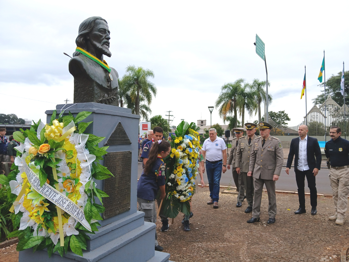 Durante a cerimônia, também foi realizada a deposição de uma coroa de flores em homenagem ao patrono, conduzida por escoteiros e acompanhada por autoridades locais, em um gesto de reverência à memória histórica e aos ideais de liberdade e soberania nacional.