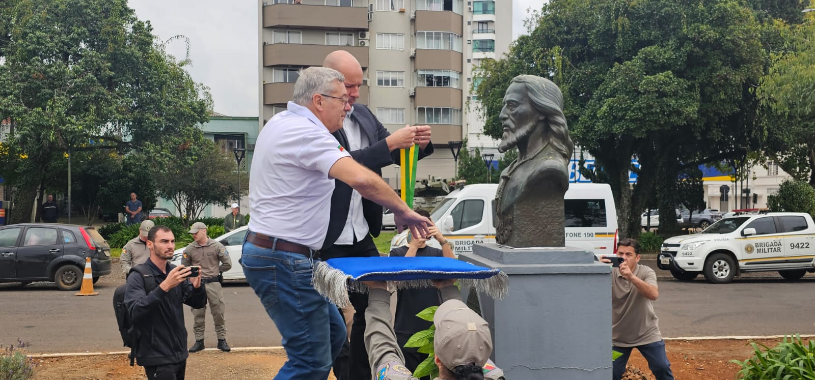 Um dos pontos centrais da solenidade foi a entrega simbólica da Medalha Tiradentes junto ao busto do homenageado. A honraria, que representa o reconhecimento ao legado de Tiradentes e os valores de patriotismo e dedicação à segurança pública, teve sua guarda transferida para a 2ª Companhia do 3º Batalhão de Polícia Ambiental da Brigada Militar, responsável por mantê-la até a próxima edição do evento.
