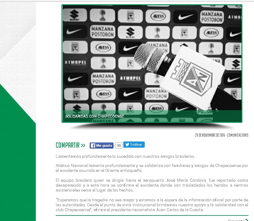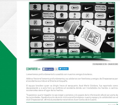O Atlético Nacional S.A, time que jogaria a primeira partida da final da Copa Sulamericana com o a Chapecoense, divulgou em seu site uma nota se solidarizando com os brasileiros pelo ocorrido.