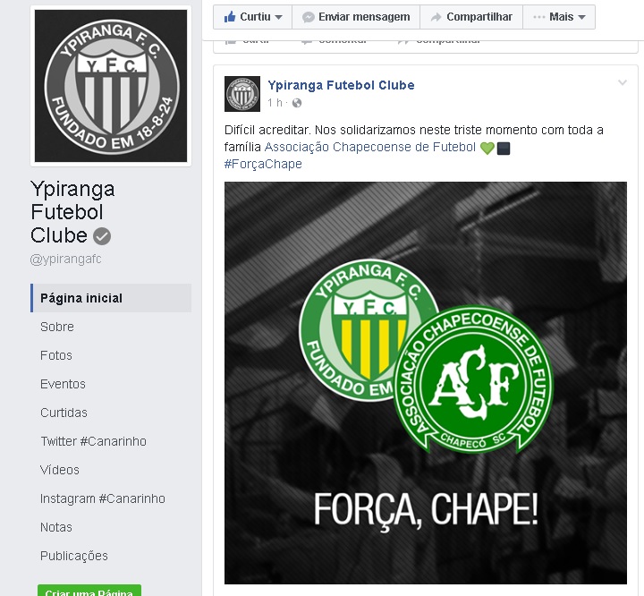 O Ypiranga de Erechim postou em seu site oficial a seguinte nota: “A Diretoria Executiva, Conselho Deliberativo, Funcionários, Atletas e Torcedores do Ypiranga Futebol Clube se solidarizam com toda a comunidade de Chapecó – SC, pela tragédia que atingiu o futebol catarinense e brasileiro na madrugada desta terça-feira, 29 de novembro de 2016”.