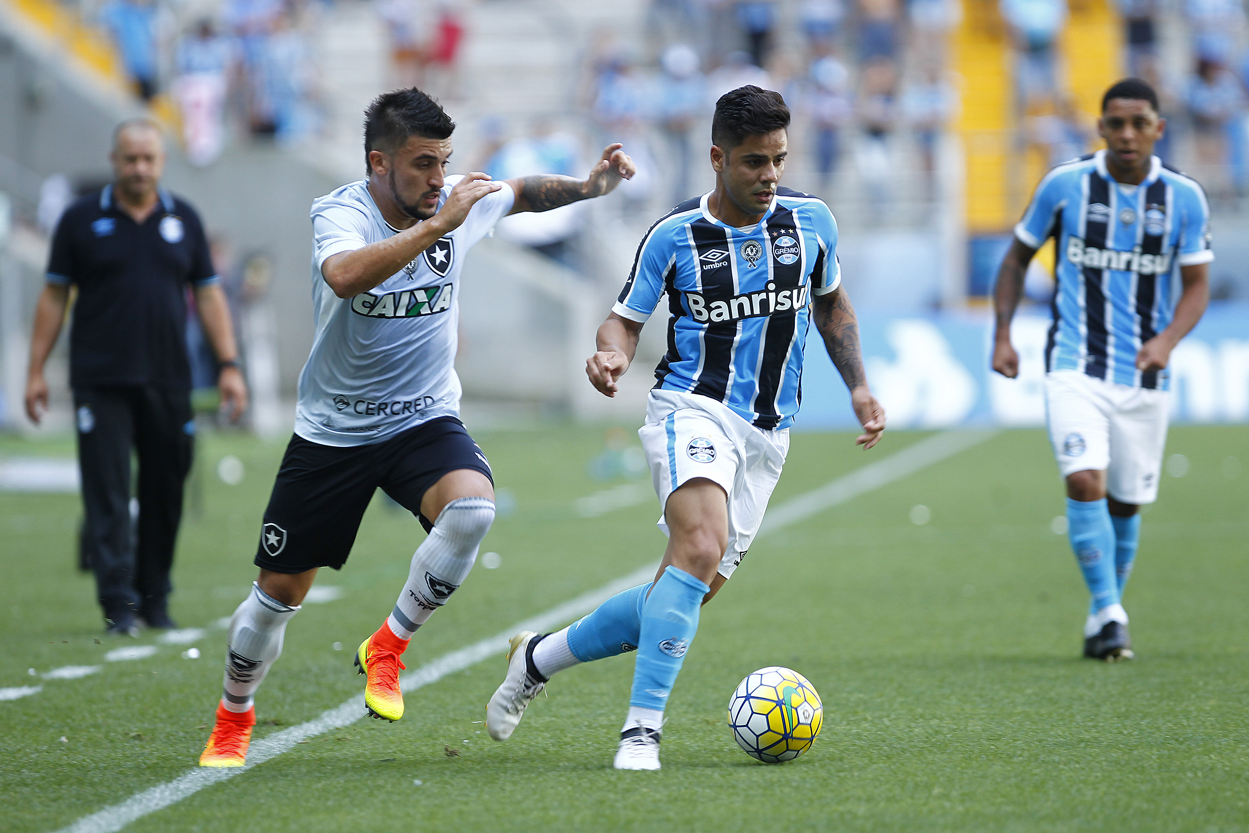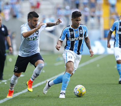 Equilíbrio. Este é o resumo da primeira etapa da partida. Apesar dos cariocas pressionarem bastante nos minutos iniciais, o Grêmio conseguiu administrar o jogo. No entanto, depois de uma cobrança de escanteio, Bruno Silva abriu o marcador para os adversário, aos 16 minutos. Depois disso, os gremistas criaram boas chances - uma com Kaio e outra com Bolaños. Já no acréscimos, o Botafogo teve um jogador expulso - Airton - após discussão com o próprio companheiro de equipe.