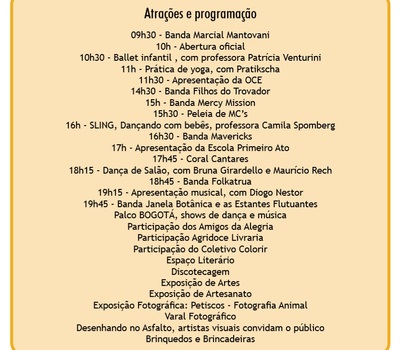 O evento aposta em um jeito diferente de ocupar o espaço urbano. As atividades serão realizadas na rua, local normalmente utilizado pelos veículos. Serão várias atrações, da música ao teatro, passando pela fotografia, pinturas, literatura entre outras manifestações da arte, além, de economia solidária para que todos os públicos possam aproveitar de alguma maneira o evento.
