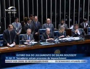 Divididos em relação às declarações da presidenta afastada Dilma Rousseff, depois de um intervalo de uma hora para almoço, senadores favoráveis e contrários ao impeachmentretomaram a sessão de julgamento do processo contra a Dilma com a manifestação do tucano Aécio Neves (MG)