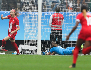 Janine Beckie comemora seu gol, o mais rápido da história do torneio de futebol feminino dos Jogos