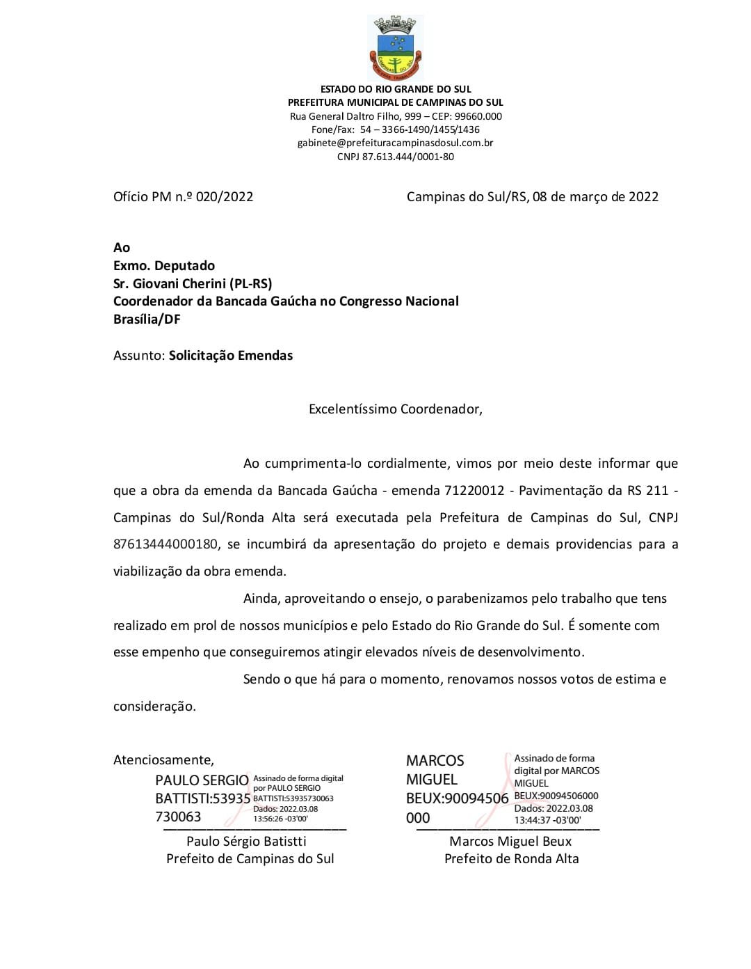 O valor de R$ 9.550.000,00 foi indicado pela Bancada Gaúcha para a pavimentação asfáltica do trecho que liga Campinas do Sul e Ronda Alta