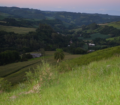 “Não deixar mais do que pegadas, não tirar mais do que fotos, não levar mais do que saudades”. A placa na entrada do Morro do Vicini - destino seguinte do passeio - é um aviso educado dos cuidados com a natureza. A bela vista que se encontra no local é anunciada ainda no caminho, já que trajeto é marcado pelas as paisagens desenhadas pela mistura das plantações de soja e trigo com as altas árvores e montanhas verdes, formadas por mata virgem. Este conjunto é, talvez, a característica que mais chama atenção no percurso realizado entre as estreitas e sinuosas estradas de chão.