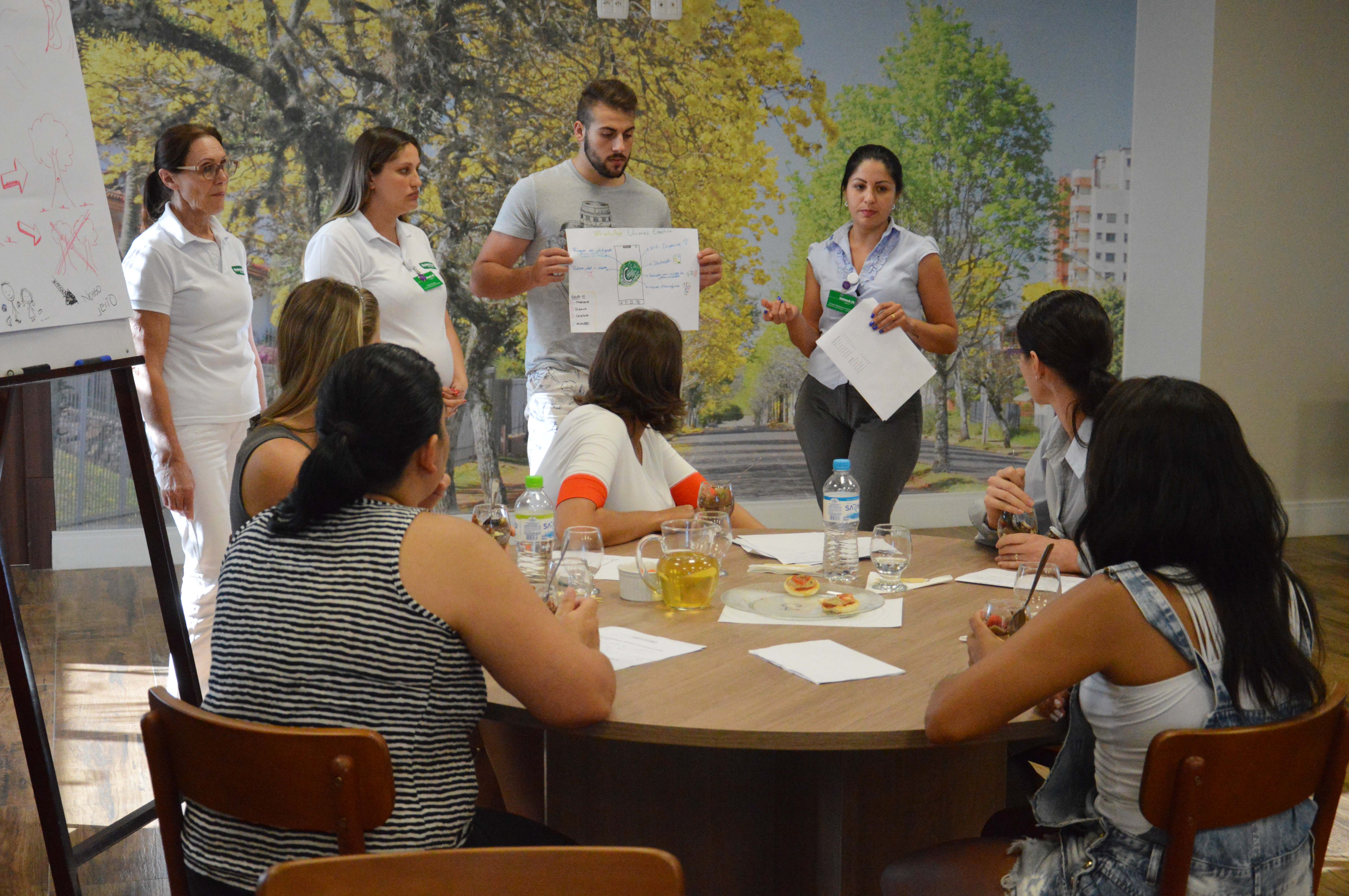 Recepcionados pela gerente de Desenvolvimento, Serviços Próprios e Inovação, Alessandra Sonda, e pela coordenadora de Gestão de Pessoas, Elisete Fronza, os participantes receberam informações sobre ações estratégicas da cooperativa médica e, posteriormente, foram convidados a apresentar soluções de comunicação que atendessem às suas expectativas.