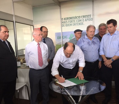 O governador do Estado do Rio Grande do Sul, José Ivo Sartori, na presença do presidente do Banco Regional de Desenvolvimento do Extremo Sul – BRDE, Odacir Klein, do presidente da Unimed Erechim, Alcides Mandelli Stumpf e do vice-presidente da Unimed Erechim, Paulo César Rodrigues Martins, assinou o termo de financiamento no valor de R$ 6 milhões para a expansão de seu hospital dia, a Uniclínica. O ato foi realizado na segunda-feira, 06, na Casa do BRDE na Expodireto Cotrijal, em Não-Me-Toque.